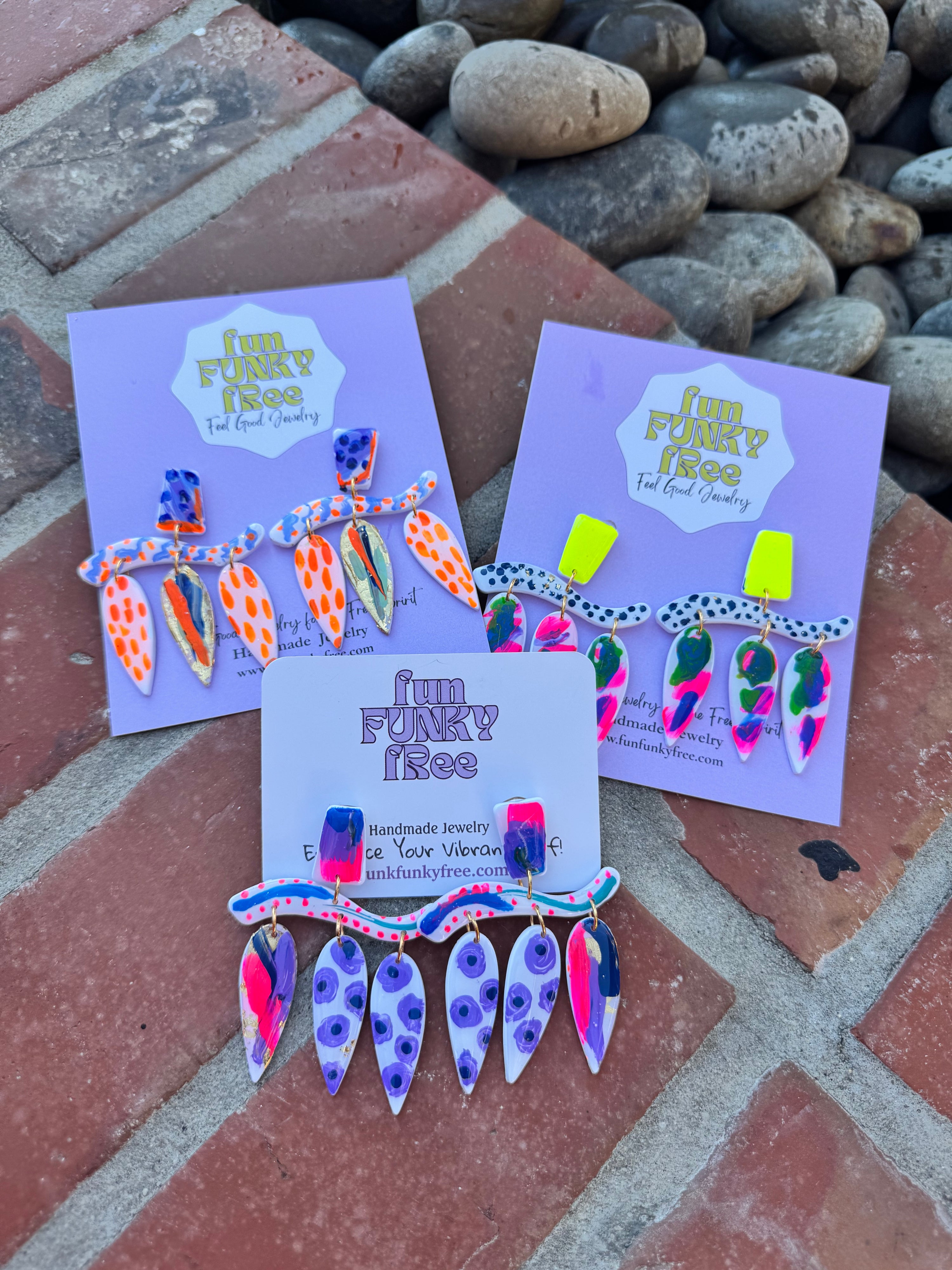 Think petals, pops of color, playful shapes, and bold energy—each pair is one-of-one and made to stand out.